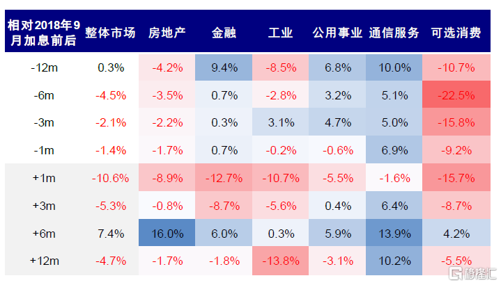 图表36:在2018年加息周期中,通信服务、金融和公用事业板块在汇率上调前后均表现较好;房地产后拾动力