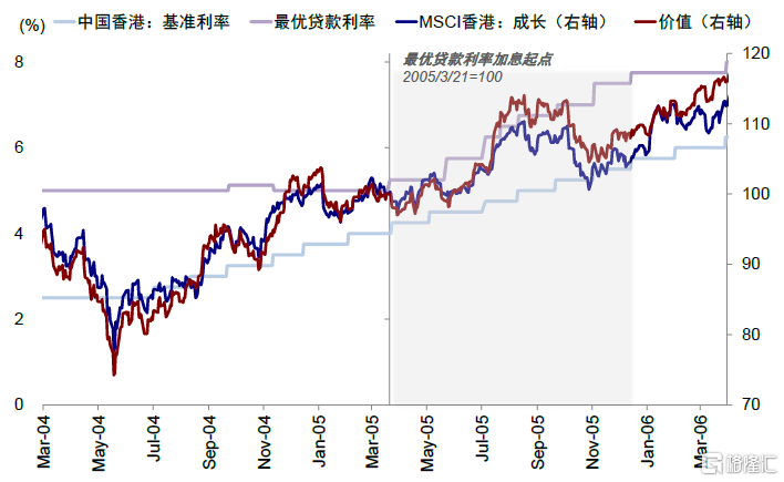 图表31:在2005年香港最优贷款利率的加息周期中,价值股整体表现要明显好于成长股