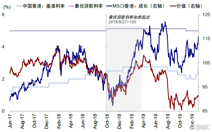 在2005年3月到2006年3月以及2018年9月这两轮香港最优贷款利率加息周期中,我们从香港整体经济、房地产市场、港币汇率、资金流向、股市、以及不同风格和板块轮动情况来看,发现一些历史经验,具体如下:
