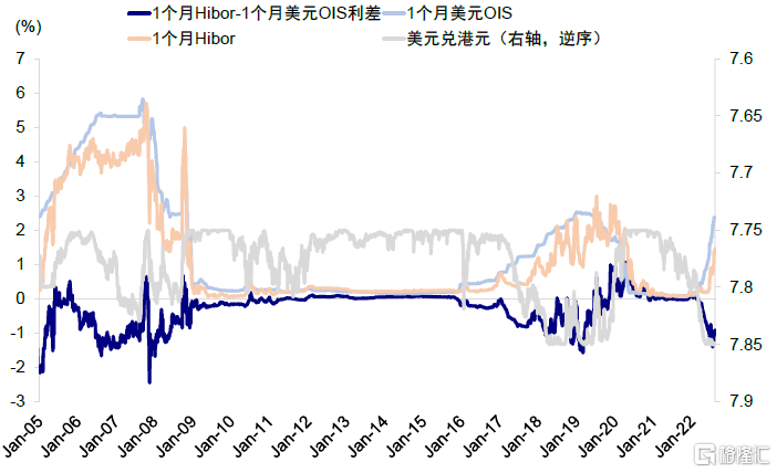 2) Hibor的变化与联系汇率制度的设计有关,虽不一定完全同步但基本跟随。港美利率倒挂(如Hibor-美元OIS)会导致套息资金外流和港币走弱,而当港元触发弱方兑换保证后,金管局干预收紧银行间总结余,进而推升银行间的融资成本Hibor,达到支撑港币汇率的效果。