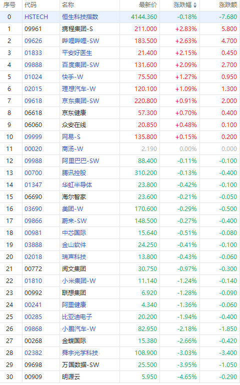 恒生科技指数成分股中,携程集团涨2.83%,哔哩哔哩涨2.63%,平安好医生涨2.15%,百度涨2.09%。快手涨1.27%,京东涨0.91%,两家公司将于今日公布业绩;