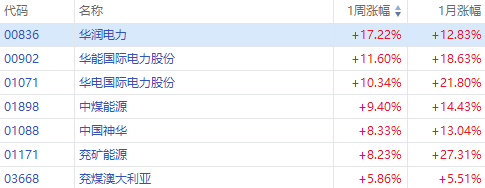 截至8月23日午间,港股电力板块周内涨超5%,其中华润电力、华能国际电力股份本周皆升超10%,华电国际电力股份月内更是大涨超20%。而煤炭板块,兖矿能源、中煤能源一周亦是累计涨近10%,月内分别涨超27%、14%。