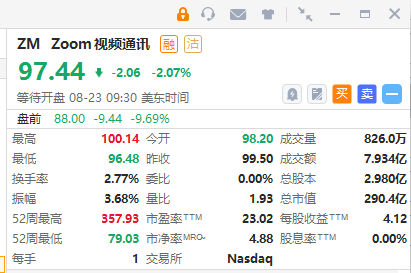 华盛资讯8月23日消息,美股盘前,三大期指走高,纳指期货涨0.4%。截至发稿,Zoom视频通讯大跌近10%,公司周一盘后发布业绩,Q2净利润同比大幅下降86%至4574.6万美元,下调第三季度和全年业绩指引。