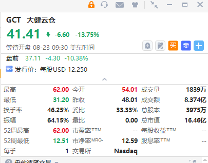 次新股大健云仓盘前下跌,截至发稿跌10.38%。该股上市三日涨幅近240%,公司从事大件商品出口的B2B交易,是全球领先的国际贸易数字化服务商。