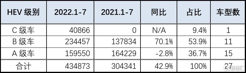表三:HEV车型级别销量及同比