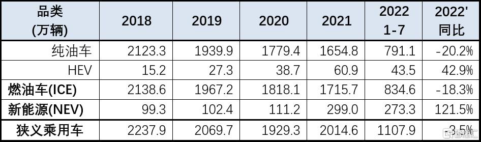 近年来,乘用车市场整体零售需求在2000万辆上下波动,乘用车产品结构发生了不少变化,首先是最近两年新能源车市场以年均145%的增速迅速崛起,其次是HEV市场以年均50%以上的增速进入用户视野,而燃油车(ICE)今年以来同比下降20.2%(见表一),在未来相当长的时间内,燃油车仍会占有很大的市场,它会与新能源车及HEV车处于互相竞争的关系。