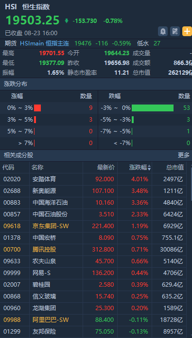 美股隔晚急挫,Jackson Hole全球央行年会即将登场,投资者担心联储局主席鲍威尔或释出鹰派言论,美债息及美汇急升,美股亦大幅下跌。今日早盘,恒指低开低走,午后跌幅进一步扩大,截至收盘,恒指跌0.78%,报19503.25点,吉利汽车大跌6.26%领跌蓝筹。