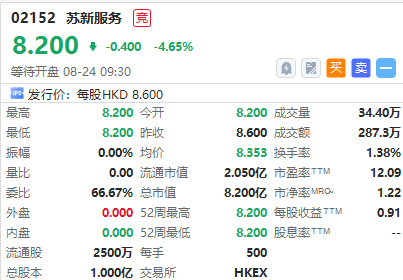华盛资讯8月24日讯,物管服务商苏新服务 $02152.HK 首挂低开4.65%,报价8.20港元,盘前成交额287万港元,最新总市值8.20亿港元,昨日暗盘收跌1.28%。