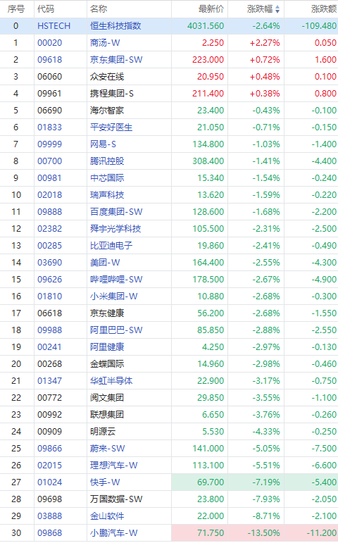 快手-W财报后走低,跌7.19%,阿里巴巴-SW、小米集团-W、哔哩哔哩、美团跌超2%,腾讯控股、百度、中芯国际跌超1%。