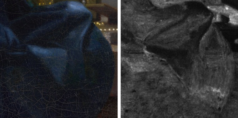 《持天平的女子》X射线图像下的底色(右)的笔触与表面(左)的褶皱无关,这表明维米尔修改了褶皱。
