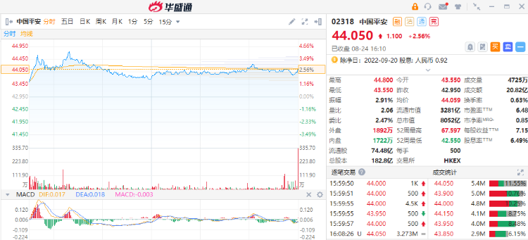 消息面上,中国平安昨日晚间披露2022年中期业绩,公司上半年实现归属于母公司股东的营运利润853.4亿元,同比增长4.3%;年化营运ROE达20.4%;归属于母公司股东的净利润602.73亿元,同比增长3.9%。中期每股分红0.92元人民币,较去年多派4.5%。