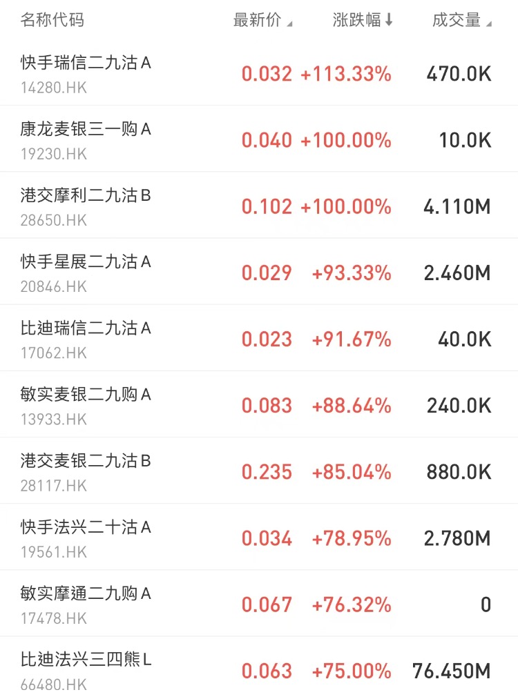 在今日涨幅榜中,快手瑞信二九沽A $14280.HK 涨113%,康龙麦银三一购A $19230.HK 涨100%,此外,港交摩利二九沽B $28650.HK 涨100%。