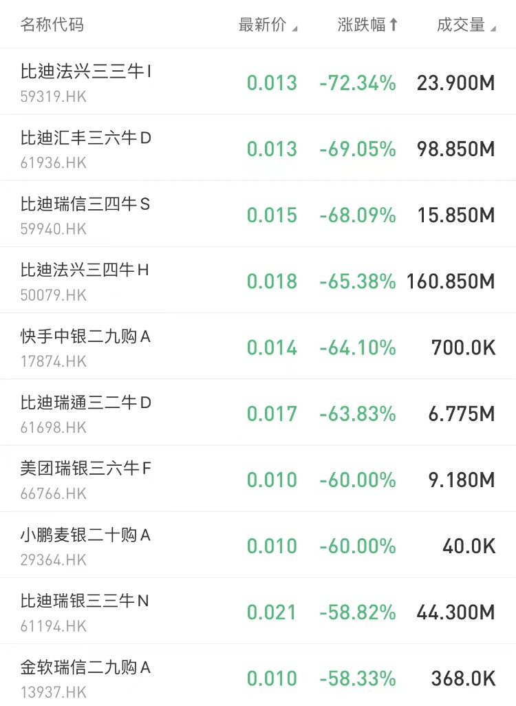 在今日跌幅榜中,比迪法兴三三牛I $59319.HK 跌72.34%;快手中银二九购A $17874.HK 跌64.1%。