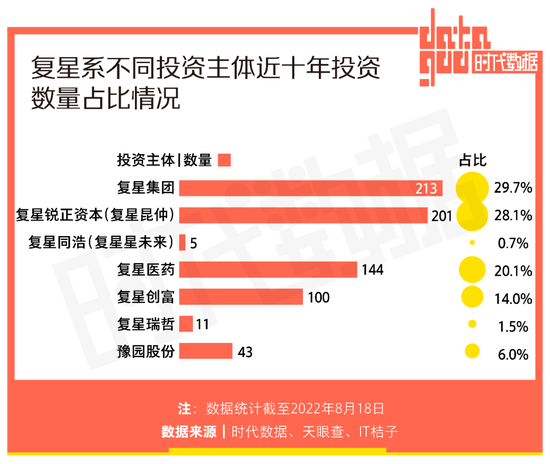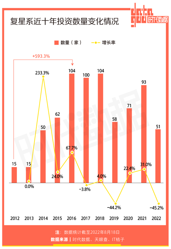 “买买买”是复星系的发展本色。回顾复星近十年投资轨迹,自2012年以来,复星的投资势头不断上涨,据时代数据统计,2016年全年,复星累计投资104次,对比2012年,增长幅度达593.3%。2019年、2020年复星投资的脚步略微放缓,在2021年复星再度加快投资脚步,投资数量回升。截至今年8月18日,复星就已累计投资51次。