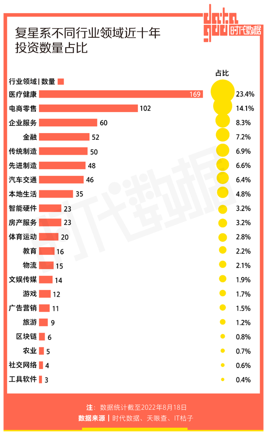 一直以来,复星都将自身描述为“一家创新驱动的全球家庭消费产业集团,深耕健康、快乐、富足、智造四大业务板块”。截至目前,复星的投资版图伸到了制造、金融、文旅、房地产等多个领域。从投资行业领域来看,健康版块是复星的主攻版块,近十年投资数达到169,占比23.4%。