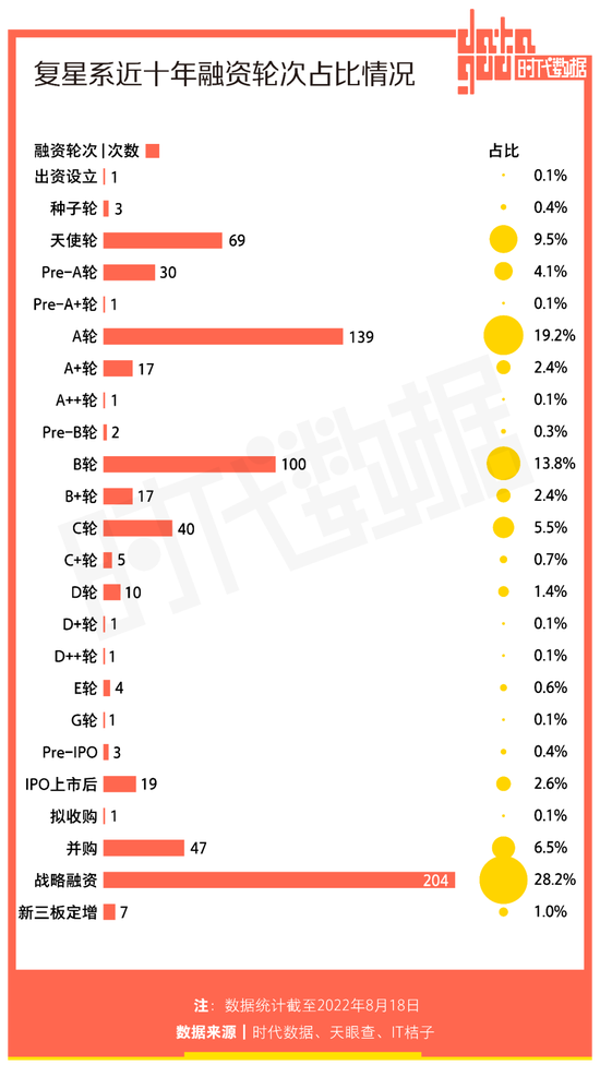 对产业投资从而获取自身发展,是复星一直以来的经营逻辑。从近十年融资轮次分布来看,复星偏爱战略投资,通过投资不同行业的项目以换取自身业务优化与协同发展。在所有融资轮次中,战略融资的参与次数最多,占比28.2%。此外,复星更偏向于投资处于中期发展阶段的企业,其所参与的A轮、B轮融资远多于天使轮融资,占比分别为19.2%、13.8%。