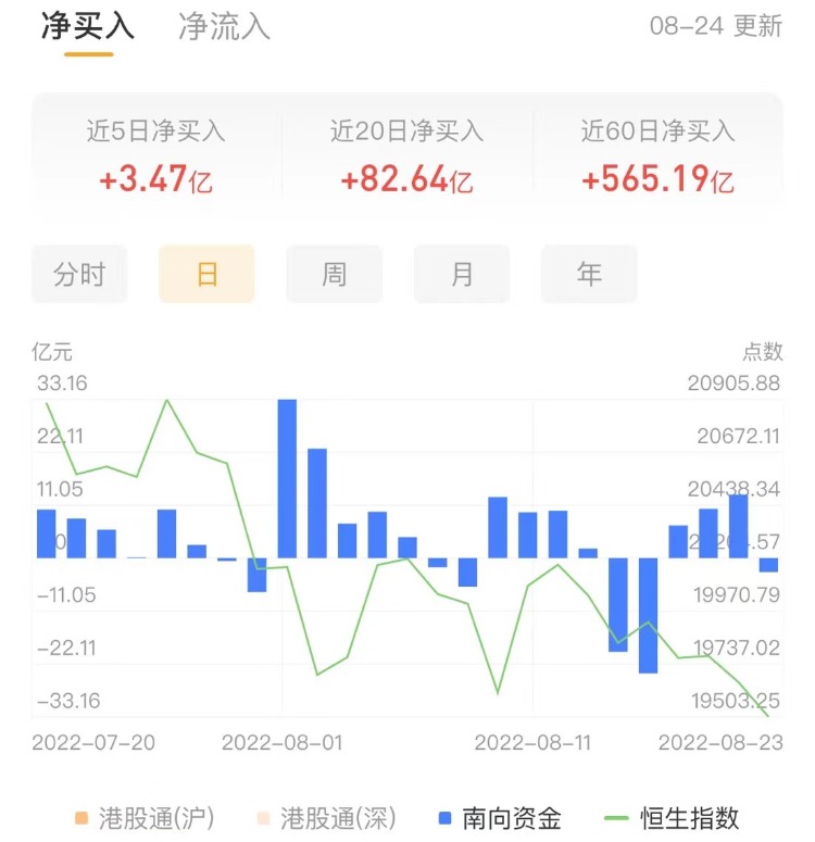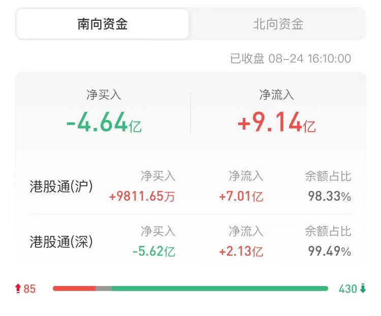 南下资金今日净卖出港股4.64亿港元,其中港股通(沪)净买入0.98亿港元,港股通(深)净卖出5.62亿港元。上一交易日净卖出港股2.92亿港元。