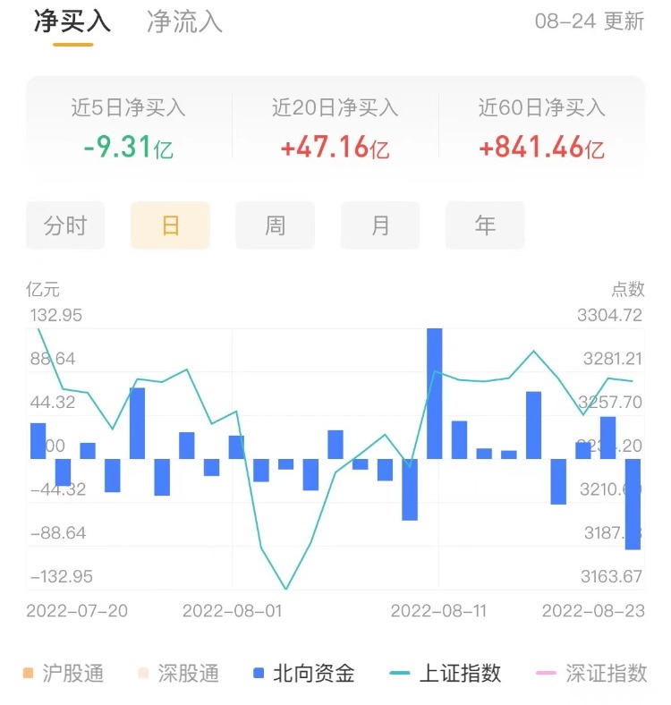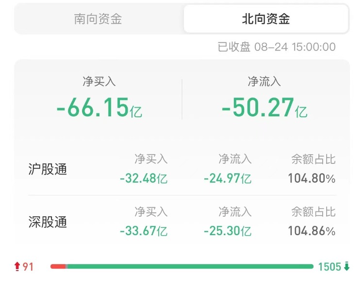 北上资金今日净卖出66.15亿元,沪股通净卖出32.48亿元,深股通净卖出33.67亿元。上一交易日净卖出92.28亿元。