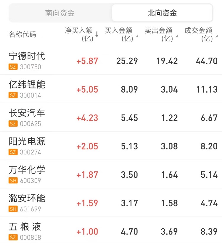 北上资金今日净买入宁德时代5.87亿元,为今日买入之最;净买入亿纬锂能5.05亿元。