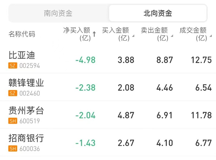 今日北上资金净卖出比亚迪4.98亿元,赣锋锂业遭净卖出2.38亿元。