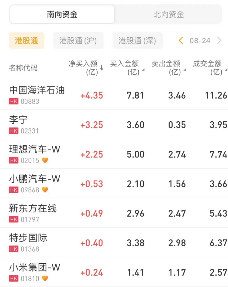 南下资金净买入中国海洋石油4.35亿港元,为今日买入之最。此外,南下资金净买入李宁3.25亿港元,净买入理想汽车2.25亿港元。