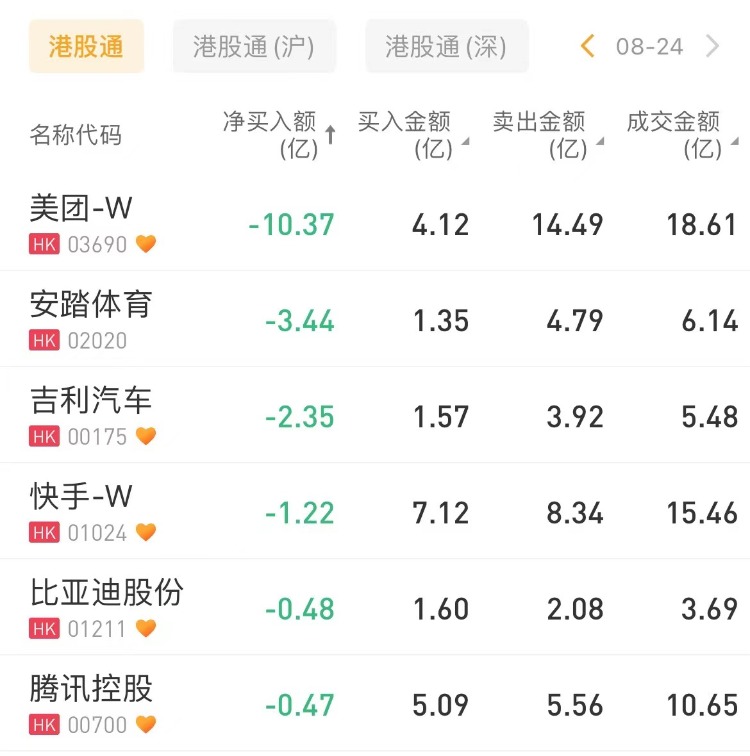 南下资金净卖出美团10.37亿港元,为今日卖出之最,净卖出安踏体育3.44亿港元,吉利汽车遭净卖出2.35亿港元。