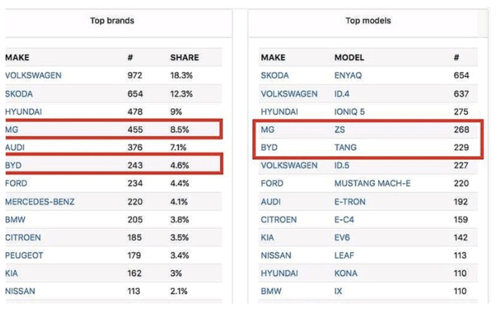 但在国内,截止到2022年08月份,MG 6新能源最新月销量为35辆,2022年累计销量为135辆。对比之下,7月挪威的新能源销量数据显示,MG和比亚迪分列品牌销量榜的第4位和第6位,其中,MG销量455辆,月度的市场份额为8.5%压过比亚迪销量243辆,月度的市场份额为4.6%。