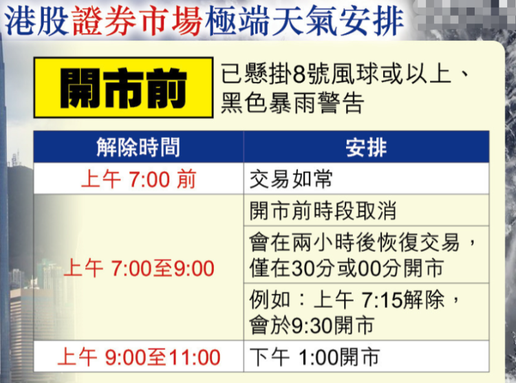 在极端天气下,对港股市场交易的影响,一般分为四种情况。