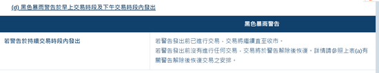 四)黑色暴雨警告于早上交易时段及下午交易时段内发出,若警告发出前已进行交易,交易将继续直至收市;若警告发出前没有进行任何交易,交易将于警告解除后恢复。详情请参照上表一)有关警告解除后恢复交易之安排。