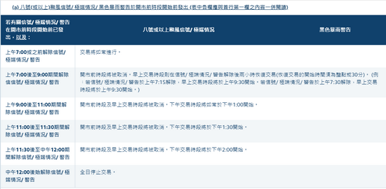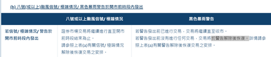 二)如果8号风球或黑暴天气在开市前时段内发出:8号以上台风情况是证券市场交易将继续进行直至开市前时段结束为止,解除情况参考一);如果是黑色暴雨警告信号,如果警告发出前已经交易,交易则继续进行直至收市。如果警告发出前没有任何交易,交易将于警告解除后恢复,解除情况参考一)。