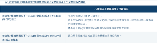 三)8号以上台风如果在早上交易时段或下午交易时段发出分两种情况:1)若信号/ 极端情况于下午3:45前(全日市)或上午11:45前(半日市)发出,交易于信号发出后15分钟停止。若下午3:45(全日市)或上午11:45(半日市)时仍未恢复交易,该交易日将不会有收市竞价交易时段。2)若信号/ 极端情况于下午3:45(全日市)或上午11:45(半日市)或之后发出,该交易日将维持正常直至收市竞价交易时段完结。