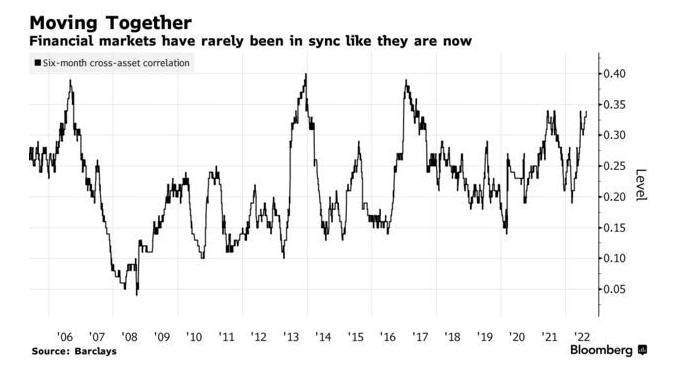 股票、债券、大宗商品都在同步波动,他们的一致波动几乎完全取决于人们对美联储收紧货币政策是否会导致经济衰退的看法。投资者对经济数据的痴迷和美联储官员的言论推动巴克莱跟踪的跨资产相关性指标几乎翻了一番,成为过去17年来的最高水平之一。