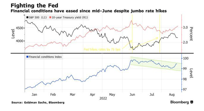 就在美联储6月中旬决定加息75个基点前后,股市和债市开始同步上涨,推动了金融状况的缓解,而这与美联储让利率上升和资产价格下降来缓和过热的需求这一目标背道而驰。