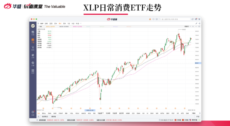 日常消费ETF $XLP 走势明显,从68美元到78美元,过程中突破全部MA线,反弹力度大。目前MA线全部都在 $XLP 蜡烛线下,趋势仍会向上。MA50为现在的一个支撑位,前高是阻力位。阿浦认为日常消费的销售量整体被大众影响持续上涨,未来可以继续关注日常消费品类。