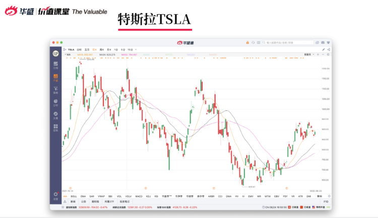 在技术层面上,特斯拉所有技术指标皆向下,之前两次反弹都没突破944美元,目前整体趋势明显向下,支撑位可以看MA34。2022年8月24日特斯拉拆股,阿浦认为,所有的拆股、合股都会影响一波回调,跌完之后再拉升,不建议回调阶段买入,拆股后再进行特斯拉趋势判断。