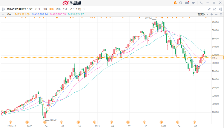 其次,我们看一下纳斯达克100指数。阿浦不认为纳斯达克100ETF $QQQ 代表大盘走势,更多的是代表科技板块,是新兴领域。