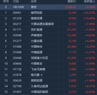 华盛资讯8月25日讯,港股煤炭股开盘后走高,截至发稿,南南资源涨超13%,报0.59港元,换手率1.45%。兖矿能源涨超7%,力量发展、伊泰煤炭涨超4%,中煤能源、中国神华涨超3%,兖煤澳大利亚涨超2%。