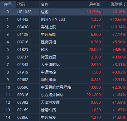 华盛资讯8月25日讯,港股航运板块走强,中远海能涨超7%,盘中一度刷新年内新高。截至发稿,报6.9港元,成交额4941.6万港元。胜狮货柜涨超5%,ESR涨超4%,中远海控涨超3%,东方海外国际涨近2%。