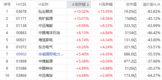 截至A股收盘,AH股涨幅前10如下: