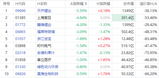 天齐锂业A股跌5.59%,H股现涨0.18%;上海复旦A股跌4.84%,H股平盘;赣锋锂业A股跌4.30%,H股跌1.35%。