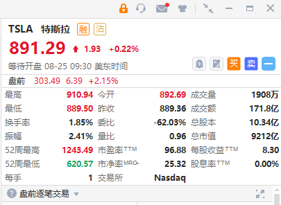 华盛资讯8月25日消息,美股盘前,特斯拉高开,截至发稿,上涨2.15%,报303.49美元,特斯拉于8月25日正式开始交易拆分的股票。三大期指走高,纳指期货涨1.1%。