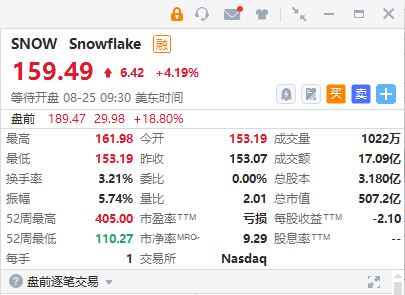 Snowflake盘前涨超18%,2023财年Q2营收同比增83%至4.97亿美元,全年业绩指引好于预期。