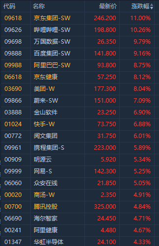 恒生科技指数大涨6%,京东集团大涨11%,哔哩哔哩、万国数据大涨10%,百度涨超9%,阿里涨8.75%,美团涨8%,蔚来涨超7%,快手涨近7%。