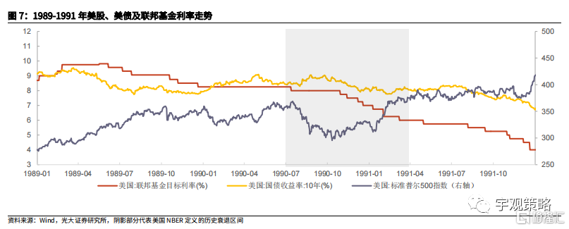 在此情况下我们可以参考1990年衰退的情况:1990年美股的走势主要跟随油价的变动,在油价回落之后,美股恢复上行。在这种情形下,我们认为美股下半年具有一定的反弹机会。