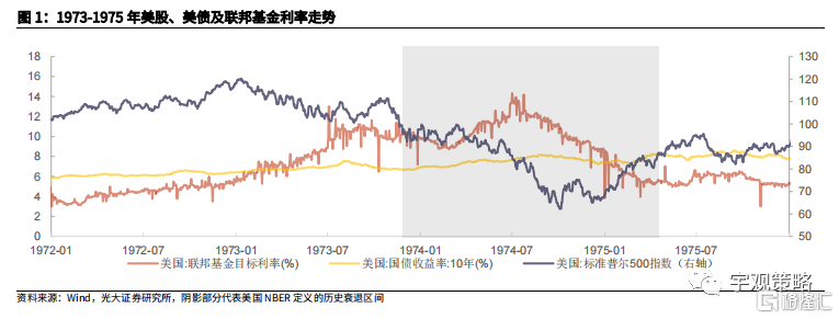 在此情况下我们可以参考1973-1975年和1980年的衰退情况:首先,通胀水平在衰退前已经保持高涨。1973-1975年和1980年分别正值第一次和第二次石油危机,中东地区局势动荡对世界石油供给产生冲击,油价升高和对供给短缺的预期使得通胀水平在实际陷入衰退前就达到了较高的地步。其次,加息周期与经济下行并行。美联储在1973年一年内通过7次加息将贴现利率从4.5%上调至7.5%,而制造业PMI指数在1972年高速增长后就持续一路下滑。最后,就业市场在前期表现较为稳定。1973年全年,美国失业率都比较稳定地维持在4.8%-5.0%的区间波动。在这种情况下美股在今年下半年大概率表现不佳,仍有继续回调的压力。