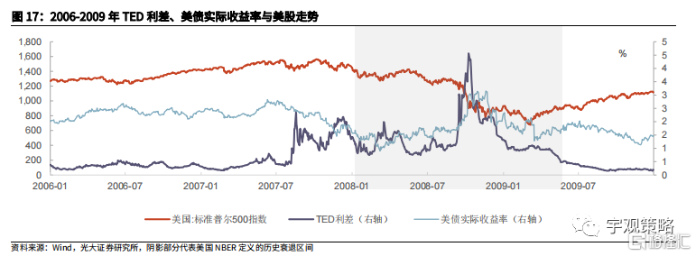 次贷危机蔓延下,美股早于衰退时点回调。互联网泡沫破灭后,地产受到青睐,美国居民储蓄率锐减、杠杆率抬升,次级抵押贷款市场得到迅速发展。2007年7月,次级贷市场一系列负面消息频发,其中以贝尔斯登旗下次级贷标的对冲基金倒闭为核心事件。到8月,法国巴黎银行冻结了旗下三支投资美国次级贷的基金。代表离岸美元流动性的TED利差出现飙升,次贷危机终于全面恶化蔓延至全球。美股在2个月内遭遇重创,跌幅近10%。为应对可能的危机,美联储于8月启动降息议程,9月实施4年来首次降息,美股迎来一轮反弹。但好景不长,10月开始油价大幅上涨,通胀再度走高,包括摩根士丹利、美林及房地产金融企业大幅亏损,美股再度下跌。