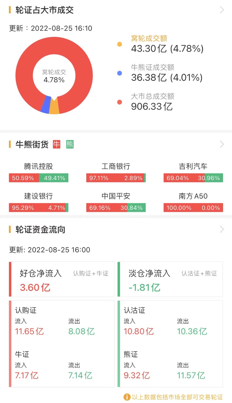 其中,窝轮总成交额为43.3亿港元,牛熊证总成交额为36.38港元。