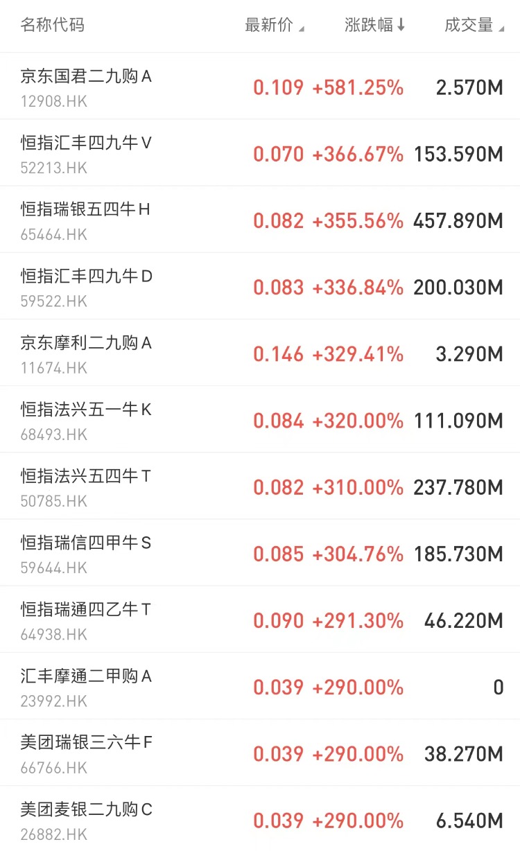 在今日涨幅榜中,京东国君二九购A $12908.HK 涨581.25%,恒指汇丰四九牛V $52213.HK 涨366.67%,此外,美团瑞银三六牛F $66766.HK 涨290%。