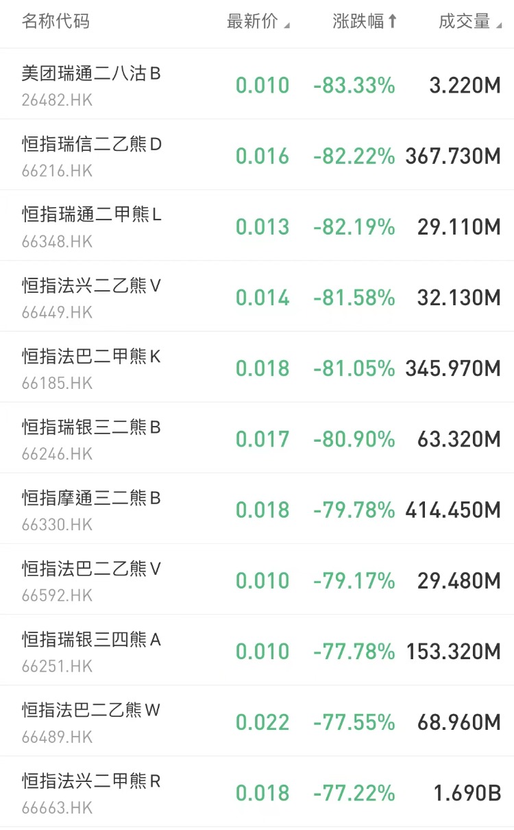 在今日跌幅榜中,美团瑞通二八沽B $26482.HK 跌83.33%;恒指瑞信二乙熊D $66216.HK 跌82.22%。