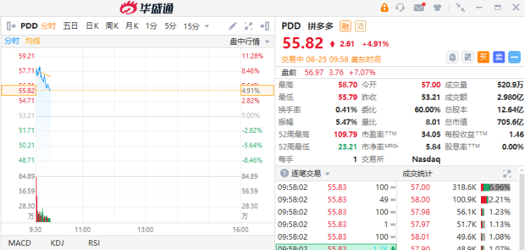 华盛资讯8月25日消息,美股盘中,中概股持续上涨。拼多多一度涨超8%,截至发稿,涨幅收窄至4.91%,哔哩哔哩涨5.3%,爱奇艺涨6.3%,京东涨5.82%,百度升4.45%,阿里巴巴涨3.58%,网易涨2.45%。新能源汽车方面,蔚来汽车、理想汽车、涨逾1%,小鹏汽车跌1%。